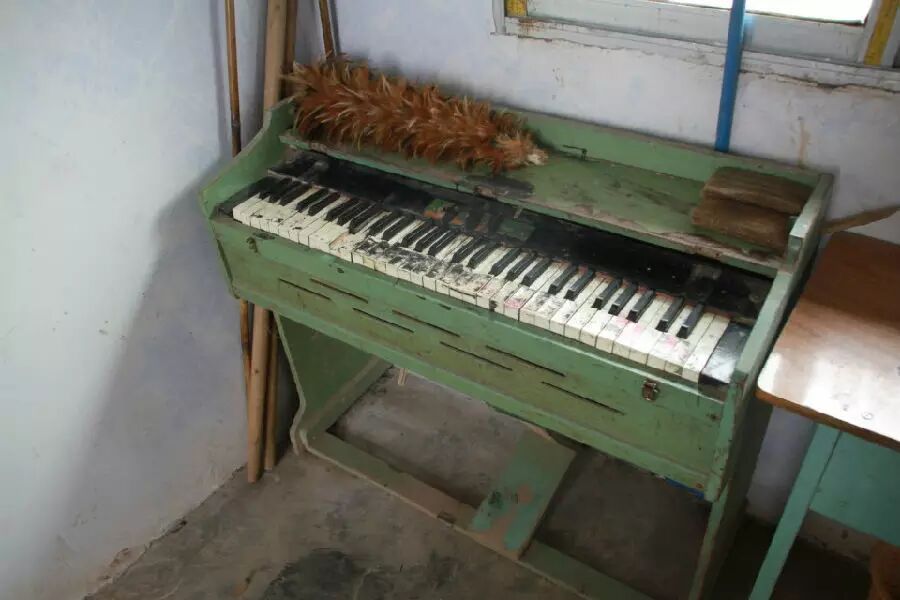 陈旧的教舍以及这台破旧的琴,是孩子们音乐课上唯一的设备。