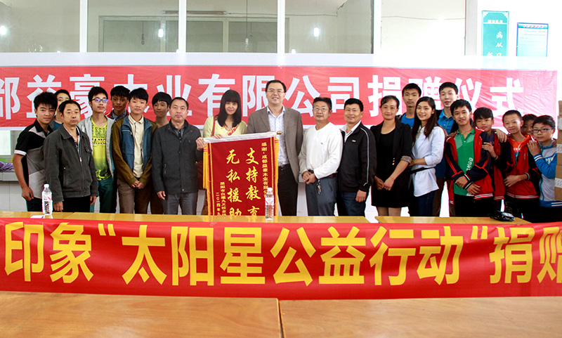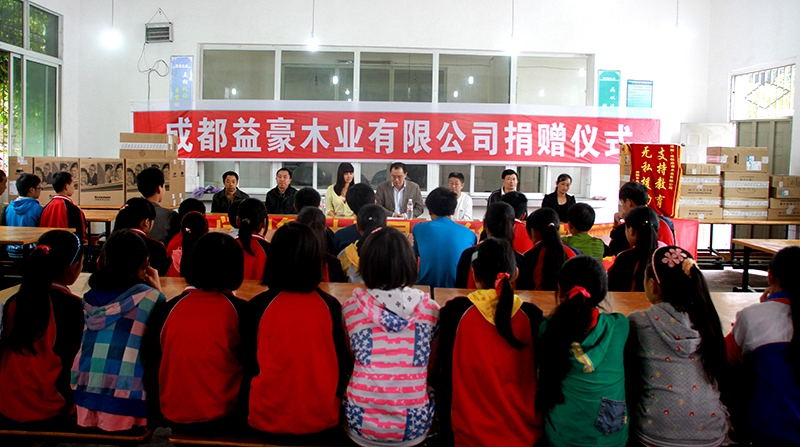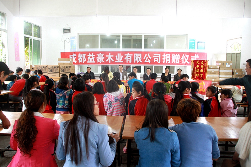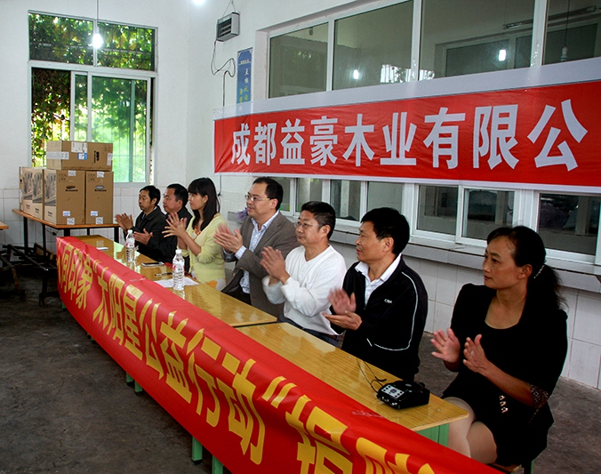 参与本次捐赠仪式的有,四川省慈善总会张玲部长,成都益豪木业有限公司董事长蔡国辉先生,成都益豪木业有限公司品牌部杨润部长,百堰九年义务学校王校长,政教主任及学校各部门领导。