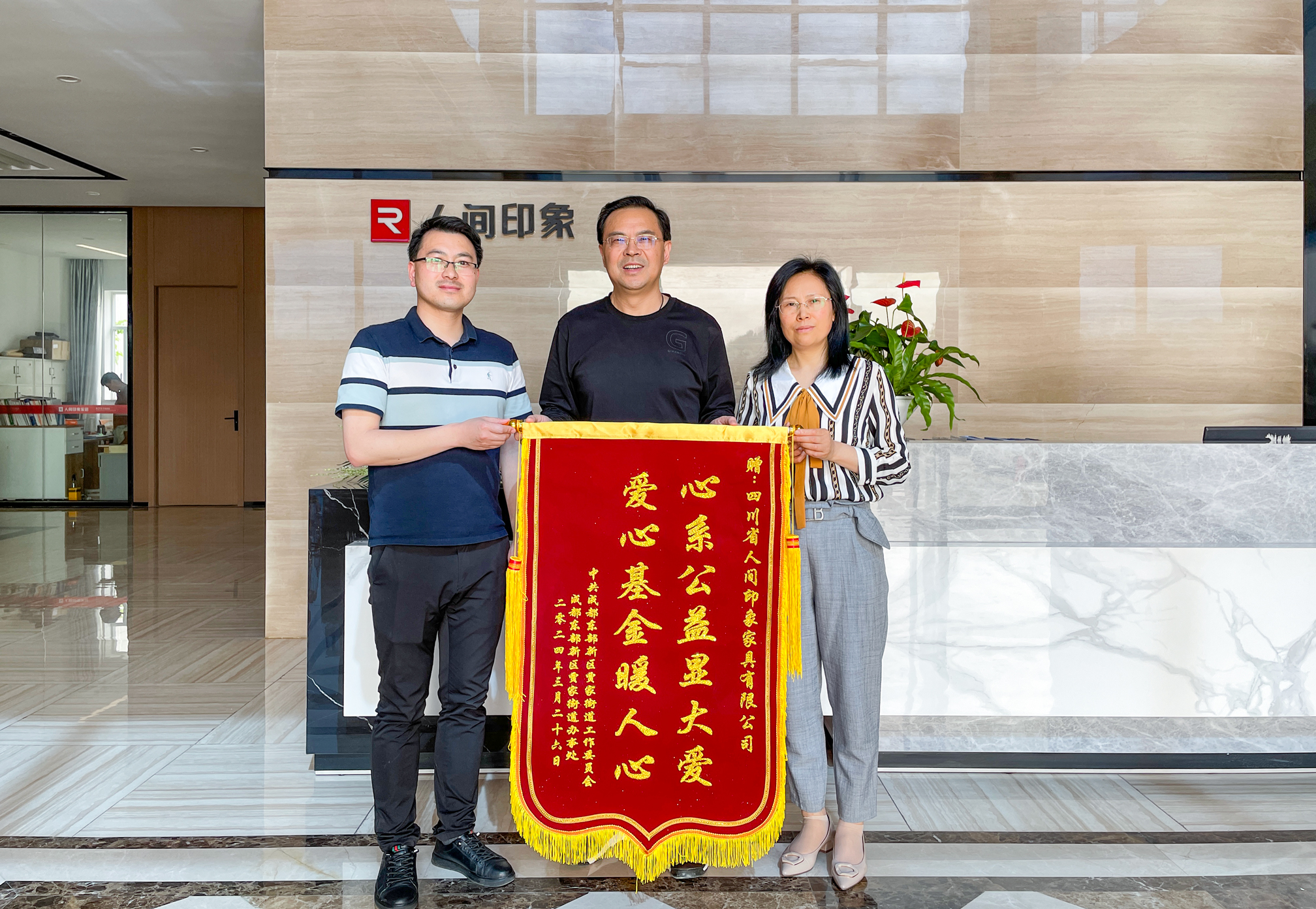 2024年3月19日,成都东部新区贾家街道办事处正式设立“成都东部新区贾家街道公益慈善基金”。四川省人间印象家具有限公司董事长蔡国辉代表人间印象向“成都东部新区贾家街道公益慈善基金”捐赠1万元慈善金,用于“一老一小“和特殊群体关怀;辖区内环境治理、教育、文化、卫生、体育、科学、基层法治事业等公益类治理项目的开展。